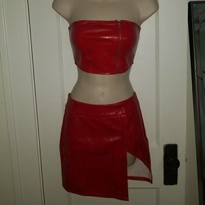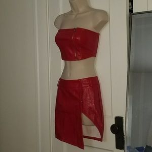 Leather look 2 piece outfit with zipper detail on the top and belt loop detail on the mini skirt. Top fits size xs. I'm a 34B/32C cup and the top was a little tight on me. The top of this set would fit a 32B or smaller chest size much more comfortably. The bottoms are also xs and looks great on. Wish it fit me. Buying the next size up for myself. Never worn, brand new.