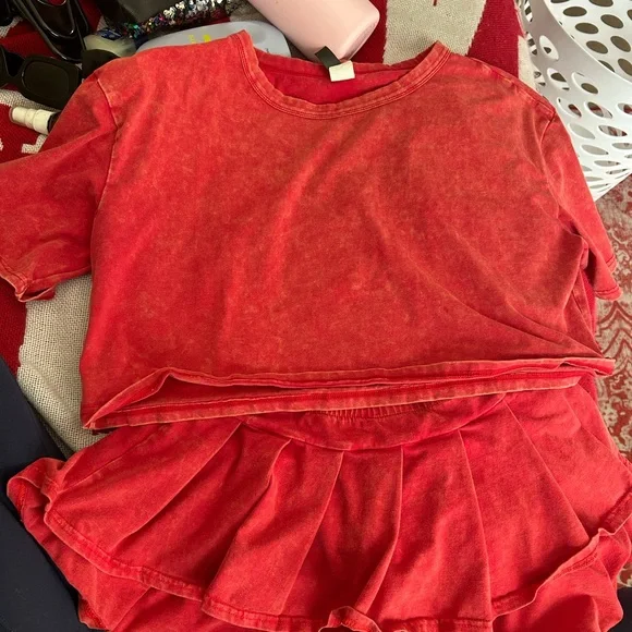 Stylish red two-piece set with a top and skirt. Perfect for casual outings.