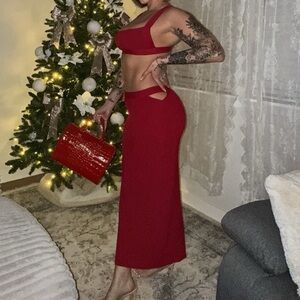 Stylish red two-piece set featuring a crop top and skirt. HANDBAG NOT INCLUDED