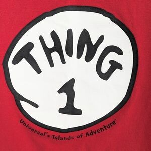 Fun and vibrant Island of Adventures red adult size M short sleeve t-shirt featuring a playful 'Thing 1' design and seamless sides. Perfect for everyday adventures.