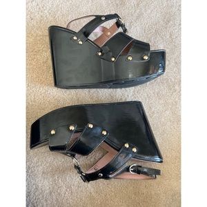 RED Valentino black patent leather wedges with gold studs.  Only worn 1  x.  Made in Italy.  Slip resistant sole.  Heel 5” platform 2”.  Shoes are in good preloved condition.  Please review all photos.