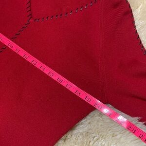 Stylish red V-neck sweater with black trim. Ideal for any occasion. Comfortable and chic.