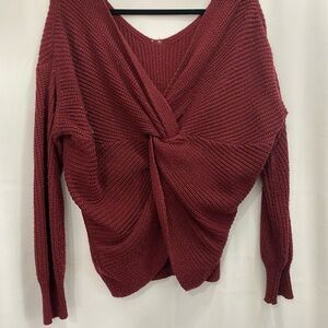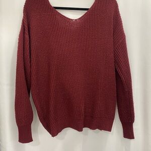 This red V-neck sweater features a ribbed knit pattern, offering a textured and stylish look. The relaxed fit ensures comfort, while the unique V-shaped cutout on the back adds an intriguing detail.