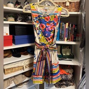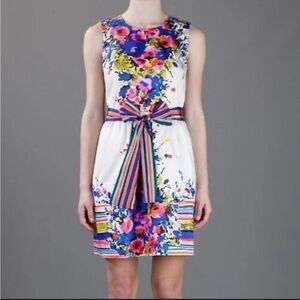 Beautiful mini cocktail dress from red Valentino. Multicolored stripe and floral print with optional tie at waist. Sleeveless with invisible zipper. Great quality and condition