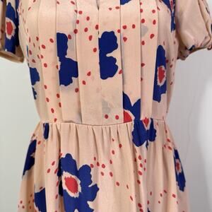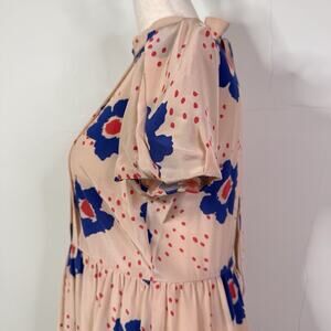This Red Valentino mini dress is crafted in luxurious 100% silk with a playful pink base, bold blue and red floral print, and scattered polka dot detailing. Featuring pleated detailing at the bodice, puff short sleeves, and a flattering high neckline with back tie closure, this feminine piece is finished with a lightly gathered skirt for a romantic silhouette. A statement yet versatile dress, perfect for cocktail parties, evening events, or chic daywear styling. Brand new with tags.