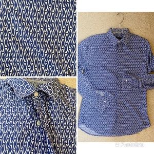 Color: blue and white with geometric fabric pattern