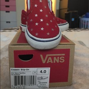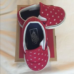 Silver stars/ red vans slip on shoes. Size 4 for toddler. They fit my daughter at 1 year old. Lightly worn.