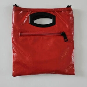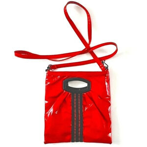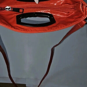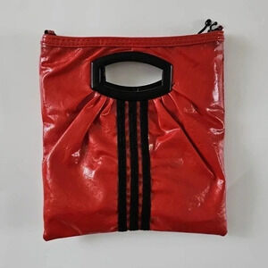 Red and Black Vegan Leather 3 strip convertable crossbody handle bag. nylon lined interior with zip pocket and zip closure. removable strap with black hardware
