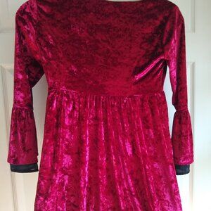 Red velvet dress with bell sleeves, black chiffon underlay and hook and loop front closure.
