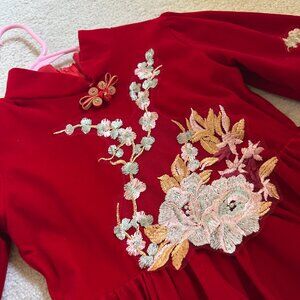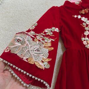 Beautiful red velvet cheongsam-inspired dress for kids, designed with elegant embroidery and pearl trim details. Features a classic mandarin collar with traditional frog button closure, long sleeves, and a flowing skirt. Perfect for Lunar New Year, weddings, cultural celebrations, photo shoots, or festive parties. Gently used and in excellent condition.