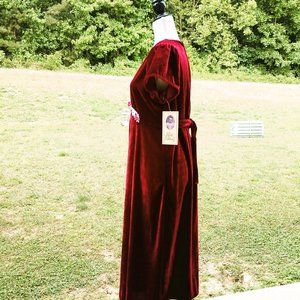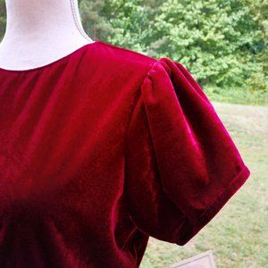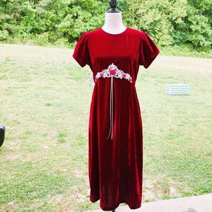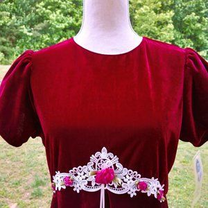 Rare Editions Red Velvet Short Sleeve Maxi Dress with Crochet Waist and Tie Back. Ribbon Roses. No crinoline
