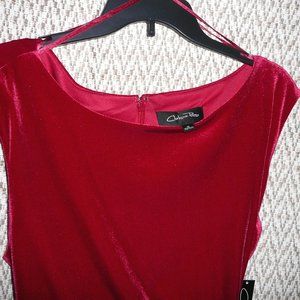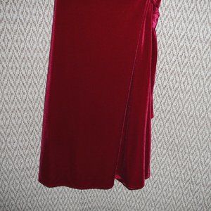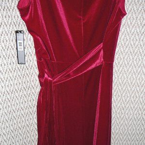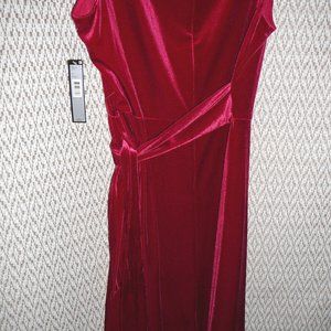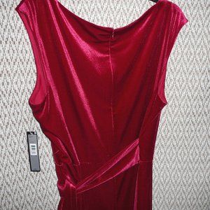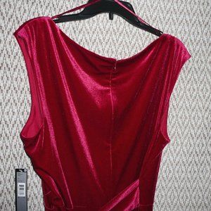New with tag, size 18, red velvet sleeveless dress. Tie on the side so you can adjust the waistline, it drapes to the left side. Back zipper. Color: Ruby Red. Material blend 92% polyester 8% elastane. Dry clean. Bust unstretched 45". Length 41". Waist unstretched 38".