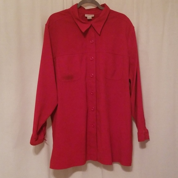 Wear layered like a jacket or buttoned like a shirt. Thick velvet material. Small stain on front pocket & back collar