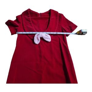 This beautiful excellent used handmade red velvet dress is perfect for any holiday party or special occasion. The retro style sheath dress features a scoop neckline and short sleeves with a removable bib, as pictured. It is made with high-quality velvet fabric and is designed to fit girls in size L.