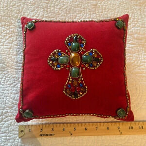 Red Velvet/ Stone Cross Square Pillow. Solid red on the back. Tag has been removed. Very clean- from a pet and smoke free home. Dimensions in pictures.