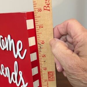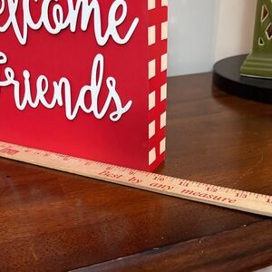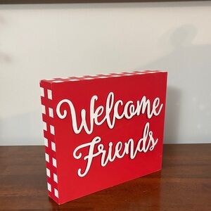Charming red sign with 'Welcome Friends' in raised white lettering. Perfect for home decor inside or porch. I've had this for about a week on my porch table so it's an excellent condition