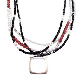 Red White Black Necklace Silver Tone Vintage Choker Bead Four Strand Square Polished Pendant Size Adjustable Curb Link Chain Lobster Claw