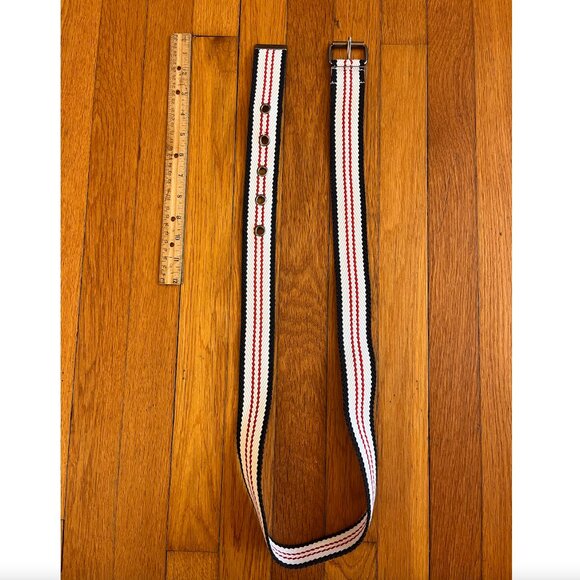 Belt is cotton, with a likely stainless steel or aluminum buckle.