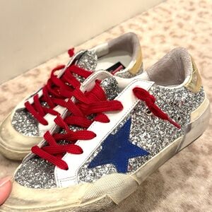 Super fun and sparkly, red, white blue, silver, and gold, golden goose sneakers!!