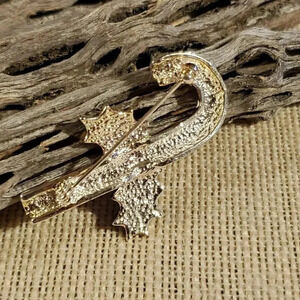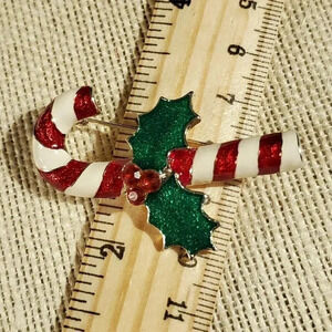 Red White Candy Cane with Holly Silver Enamel Christmas Sweater Pin Brooch