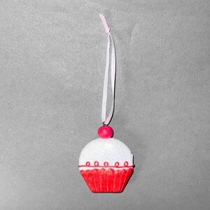 - Red & White Cupcake Ornament with red paper, edging and cherry and white icing and with iridescent glitter