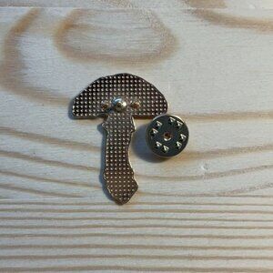 • Mushroom-shaped enamel pin with vibrant red and white detailing