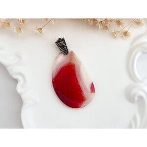 Gorgeous red and white oval freeform-ish oval shaped agate crystal pendant. The bail is silver toned and textured. The stone is polished and shiny with white sections banded into the stone. Stunning piece.