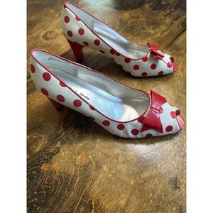 Red White Polka Dot Leather Peep Toe 2.5in Heels Bellini Bow 7 Retro Coquette
