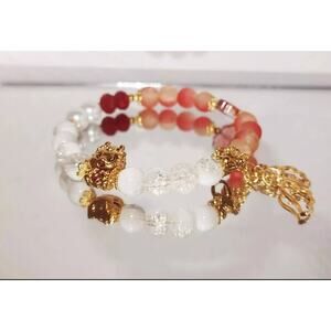 Headline: Red White Wire Bracelet w beaded Dragon and Winged Dangle Charms #971