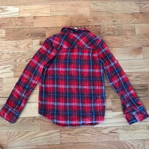 Red, white and blue plaid flannel from Check & Stripe. Button up with front pocket. Tapered on sides. Perfect for bonfires or summer concerts!