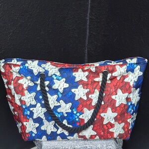 Red White and Blue Star Print Bag with Black Rope Handle Beach Bag New Stylish tote bag featuring a vibrant red, white, and blue star pattern. Perfect for adding a pop of color to any outfit.