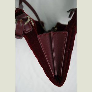 Material: Exterior Microsuede (velvet look and feel) WIth chevron like stiching accent. Interior 100% Polyester. Straps and zipper pulls are faux leather. Zipper and accents are Gold in color.
