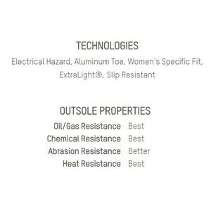 Technologies: Electrical Hazard, Aluminum Toe, Women's Specific Fit, ExtraLight, Slip Resistant