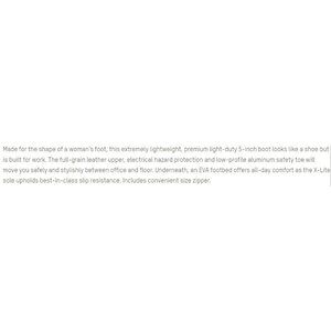 Made for the shape of a woman’s foot, this extremely lightweight, premium light-duty 5-inch boot looks like a shoe but is built for work. The full-grain leather upper, electrical hazard protection and low-profile aluminum safety toe will move you safely and stylishly between office and floor. Underneath, an EVA footbed offers all-day comfort as the X-Lite sole upholds best-in-class slip resistance. Includes convenient size zipper.