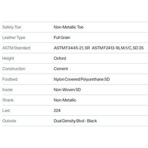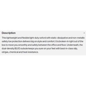 This lightweight and flexible light-duty oxford with static-dissipative and non-metallic safety toe protection delivers big on style and comfort. It is broken-in right out of the box to move you smoothly and safely between the office and floor. Underneath, the dual-density BLVD outsole keeps you sure on your feet with best-in-class slip, oil/gas, chemical and heat resistance.