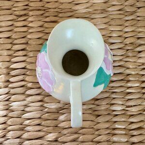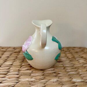 This vintage Red Wing Pottery vase from the 1940s features a floral pattern of magnolia flowers on a matte ivory ceramic material. With a mid-century modern style, this pitcher vase showcases the craftsmanship of mid-20th-century American art pottery. The vase is decorated with an impressed backstamp and is a charming piece for displaying flowers or as a decorative item.