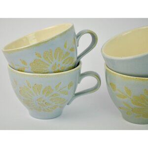 Please note: one mug is just solid blue without the brocade pattern. The other three are matching. Measures 2 7/8" tall x 3.75" diameter. Very good condition.
