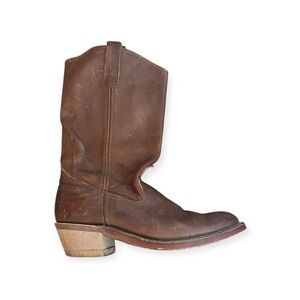 8.5 wide brown heeled boots. Durable leather construction. Some scuffs on exterior.