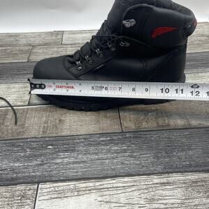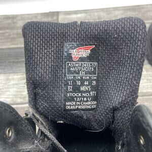 The Red Wing Shoes Motorcycle Work Safety Comp Toe Lace Up Boots in size 11 are designed for men who work in rugged environments or enjoy biking. Made of durable black leather with a lace-up closure, these boots feature a steel toe for added safety. The Red Wing brand is known for quality craftsmanship, and these boots are designed with a biker style and theme in mind. With waterproof features and a solid black color with logo accents, these boots combine style and functionality for those who need reliable footwear for demanding work or recreational activities. There is some wear and tear on the toe of the both boots and a small rip in the tongue as well as some of the silver finish chipping off of the hooks as seen in photos. E