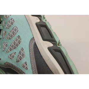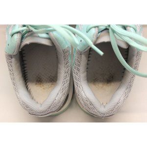 Has discoloration throughout, some on mesh, some on laces, sole and interior.