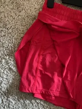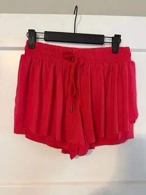 Lightweight red women's shorts with a comfortable elastic waistband and adjustable drawstring. Soft, flowy fabric and layered ruffle design for a flattering, feminine look. Easy to style for casual outings or warm-weather days.