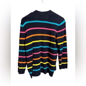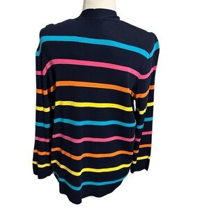 Vibrant striped cardigan. Features bold colors. Perfect for layering.