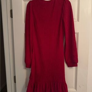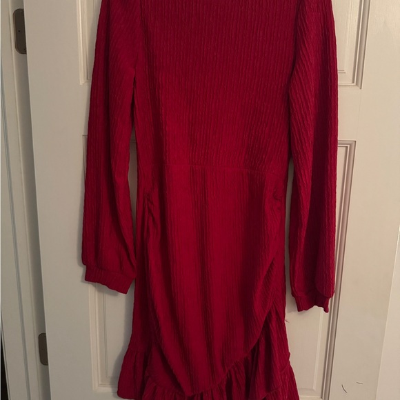 Charming burgundy dress with long sleeves. Features a playful ruffle hem. Ideal for casual outings.