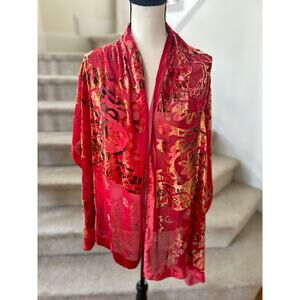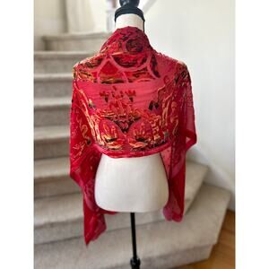 Excellent condition, no tags. Vibrant red with crushed burnout velvet yellow/gold paisley floral print. Wide style scarf, can be used as wrap pashmina style.