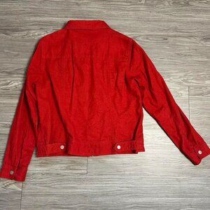 Red zip up denim-style jacket with pockets