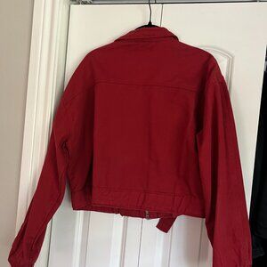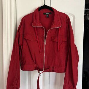Bold red jacket with front zip, drawstring collar, and waist tie detail. Cropped fit, lightweight, and easy to style for a statement look. Size [M]. Excellent condition!