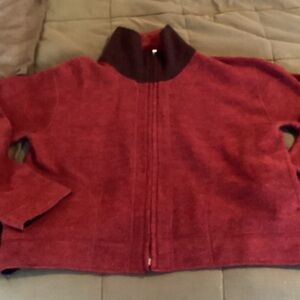 Stylish red zip-up jacket with a cozy design. Perfect for casual wear. It could be turned inside out to wear the black side. There are no tags. It feels like wool. It’s very soft and warm. There isn’t a size on it. From shoulder to bottom is 20”. From pit to pit is 20”.