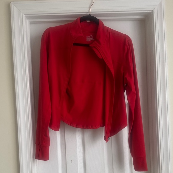 Stylish red zip-up jacket with a sleek design. Perfect for casual outings. Cropped length