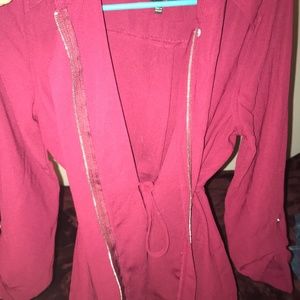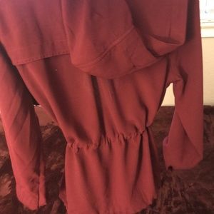 Red zipper jacket. Jacket also has ties inside the jacket to make it extra fitting. Hooded and adjustable on the bottom