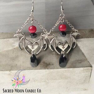 These elegant heart bat wing earrings are made of stainless steel, the chains are stainless steel as well. Adorned with red and black beads and glass teardrop beads on the ends.